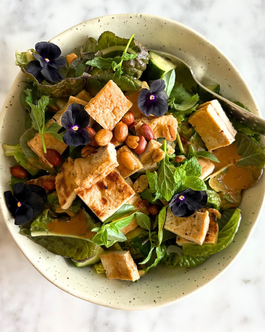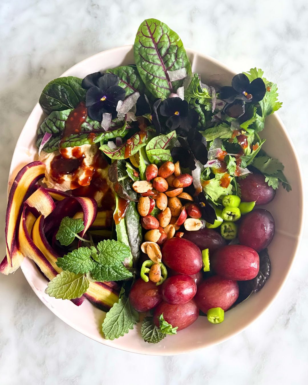 Boosters: mint, cilantro, CB’s Nuts Jalapeño Peanuts, black violas (herbs and flowers from my Gardyn; you can often find them near the salad section of many grocery stores)