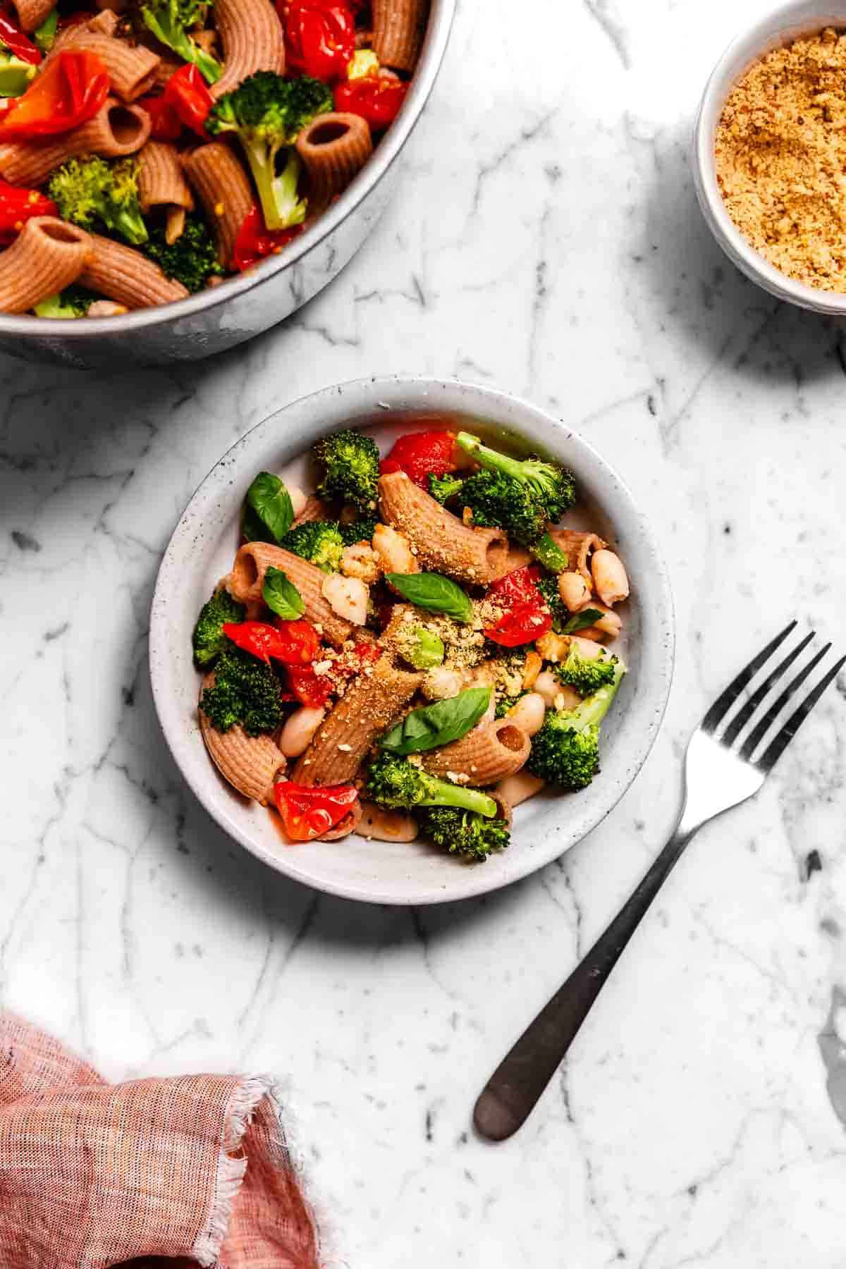 The broccoli and cherry tomatoes can roast while you make the pasta and be done around the same time, especially if using an air fryer or toaster oven (an oven works too, just takes a bit longer). An uncomplicated, delicious dinner. You can find the recipe here.