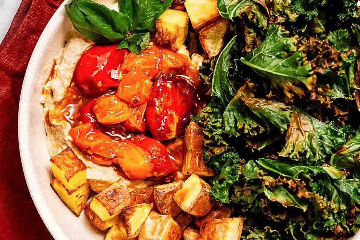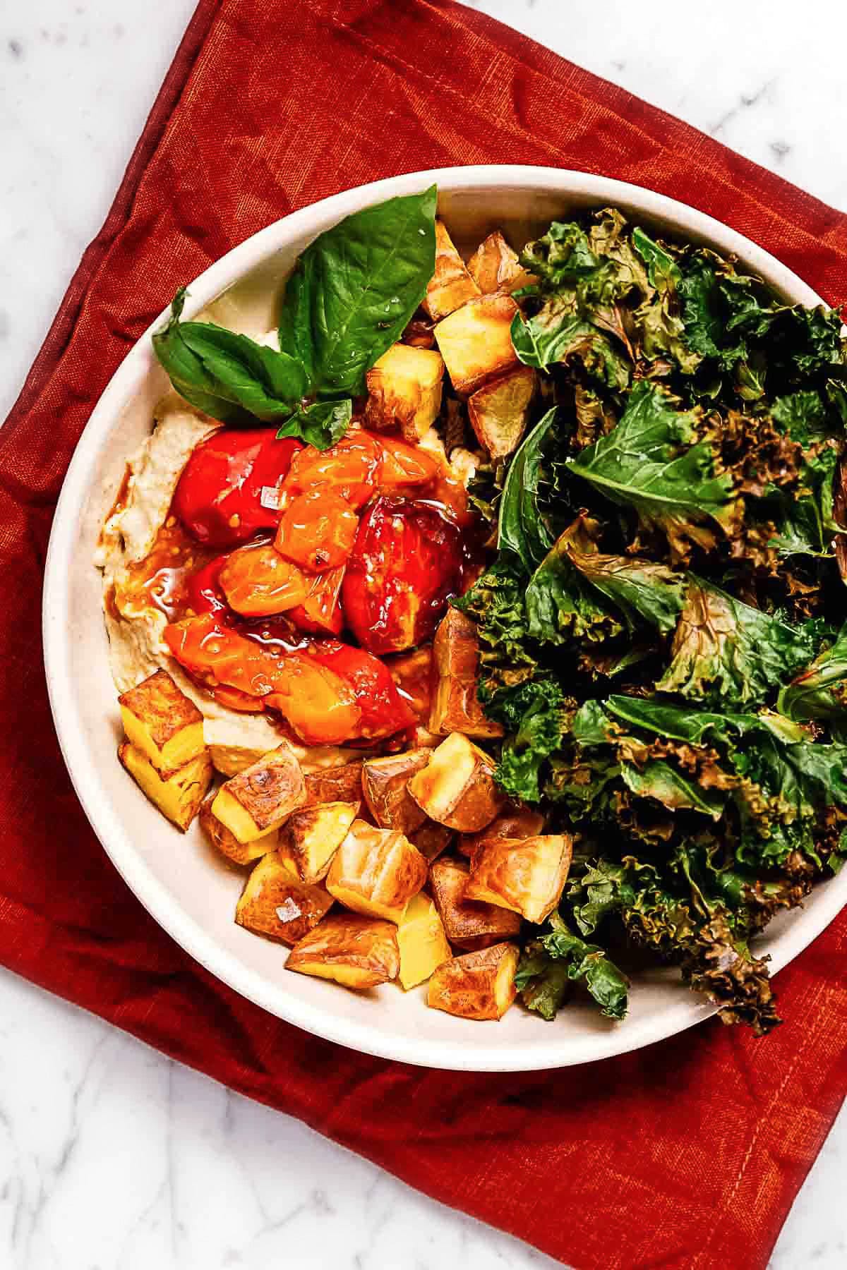 You can use an oven if you don’t have an air fryer, you just may need to double the cook time. And that’s worth doing. The flavor pops, the texture softens, and these roasted tomatoes brighten up just about any dish. Add them to a pasta, polenta, gnocchi, or whole grains. Layer it on hummus and serve alongside potatoes and greens (pictured below). I love it on avocado toast, too. This is your rodeo, do what you like. You can find the recipe here.